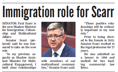 SENATOR Paul Scarr is the new Shadow Minister for Immigration, Citizenship and MulticulturalAffairs. Senator Scarr (pictured) said he was honoured to take on the new role.